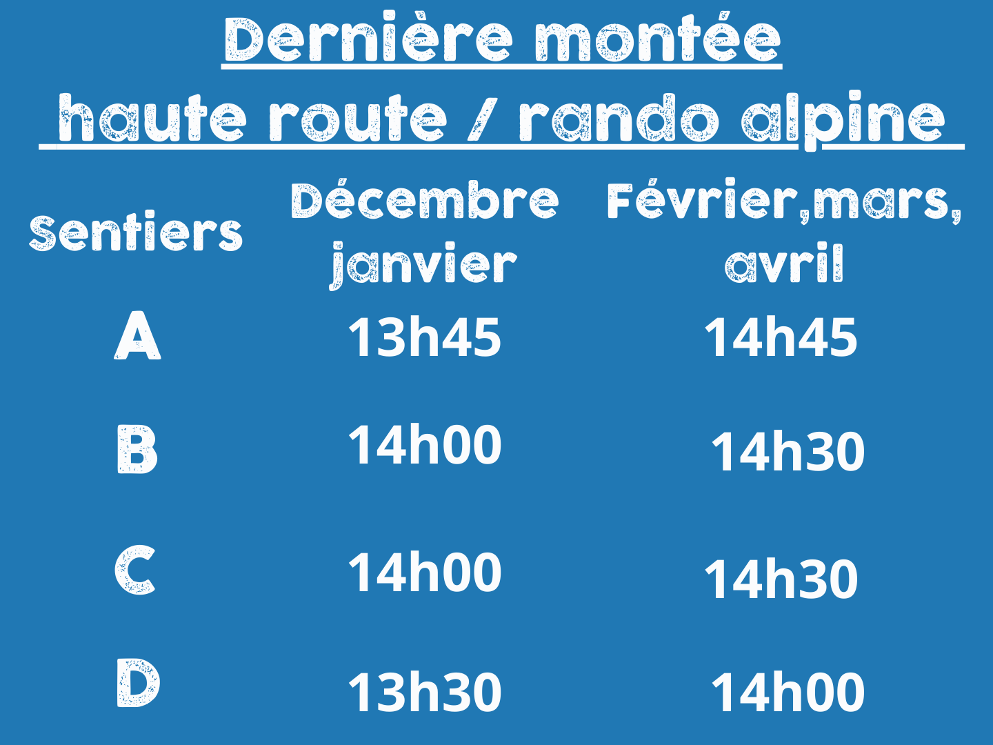 The backcountry skiing/alpine hiking open at 09:00. The last possible climb is at 02:00 pm, regardless of the trail.