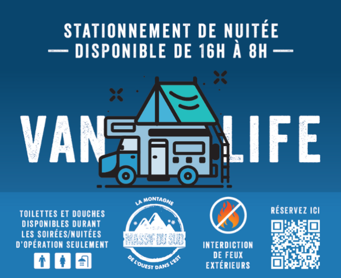 Votre emplacement de camping est accessible pour une durée de 24h à partir de 16h00 et se terminant à 16h00 le lendemain. La Station Touristique Massif du Sud 1993 inc. n’est en aucun cas responsable de vos biens dans ses aires de stationnements. Veuillez vous assurer de bien verrouiller votre véhicule.